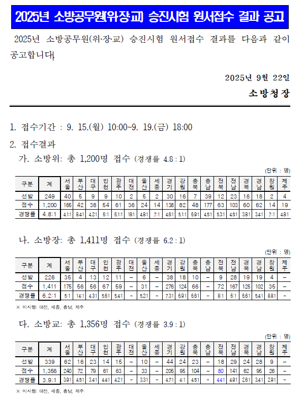 [소방][승진] 2025년 소방 (위/장/교) 승진시험 원서접수 결과