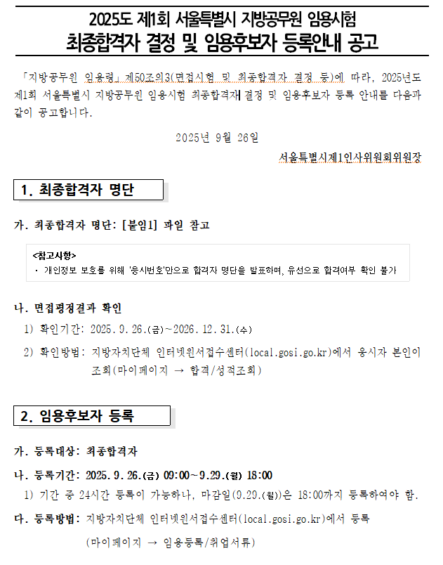2025년 서울시 지방공무원 공개채용 최종 합격자 발표가 공고되었습니다.