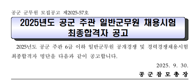 2025년 공군 일반군무원 및 장애인 구분 모집 최종 합격자 발표가 공고되었습니다.