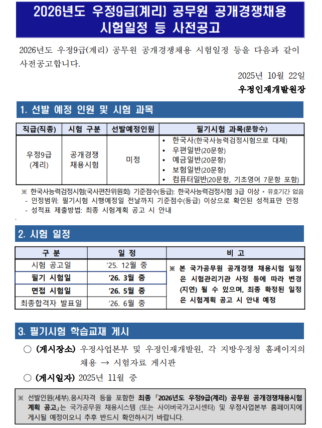 2026년도 우정9급 계리직 공무원 공개경쟁채용 시험일정 등이 공고되었습니다.