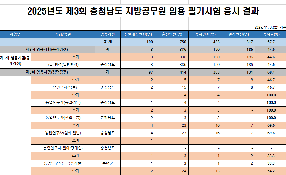 지난 11.1(토)에 실시된 2025년 충청남도 지방공무원 공개채용 시험 응시결과가 발표되었습니다.