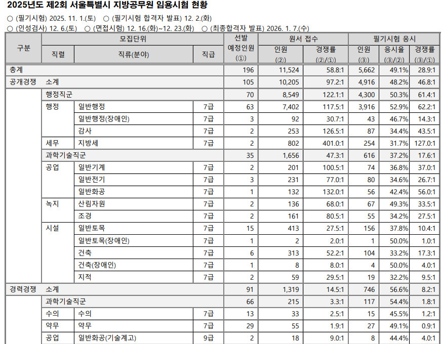 [7급][지방직] 2025년 서울특별시 지방공무원 임용시험 응시결과 (7급 外 포함)