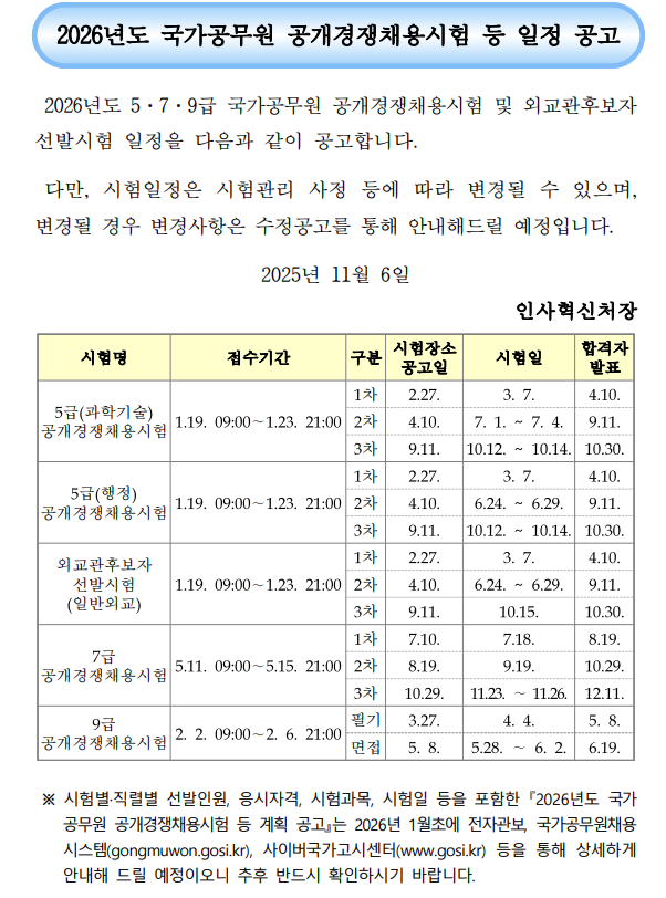 2026년도 5·7·9급 국가직 공무원 공개경쟁채용시험 일정이 발표되었습니다.