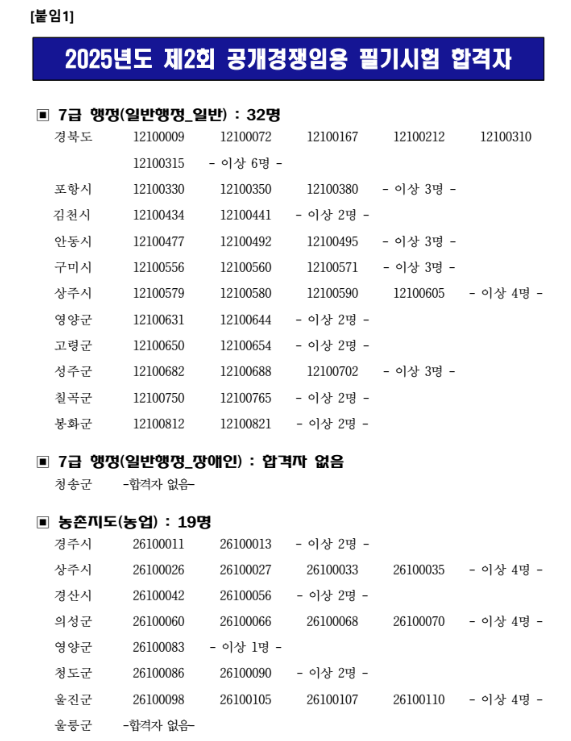[7급][지방직] 2025년 경상북도 지방공무원 필기 합격 발표 (7급 外 포함)