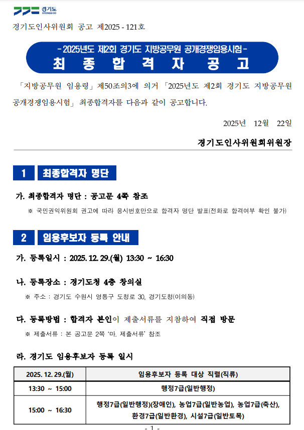 2025년 제2회 경기도 지방공무원 공개채용 최종 합격자 발표가 공고되었습니다.