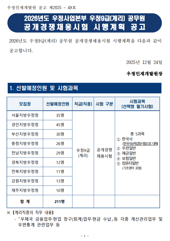 2026년도 우정9급 계리직 공무원 공개경쟁채용 시행계획이 공고되었습니다.