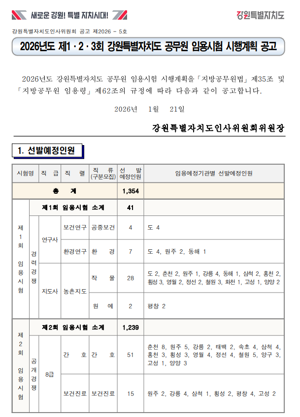 2026년 강원특별자치도 지방공무원 임용시험 시행계획이 공고되었습니다.