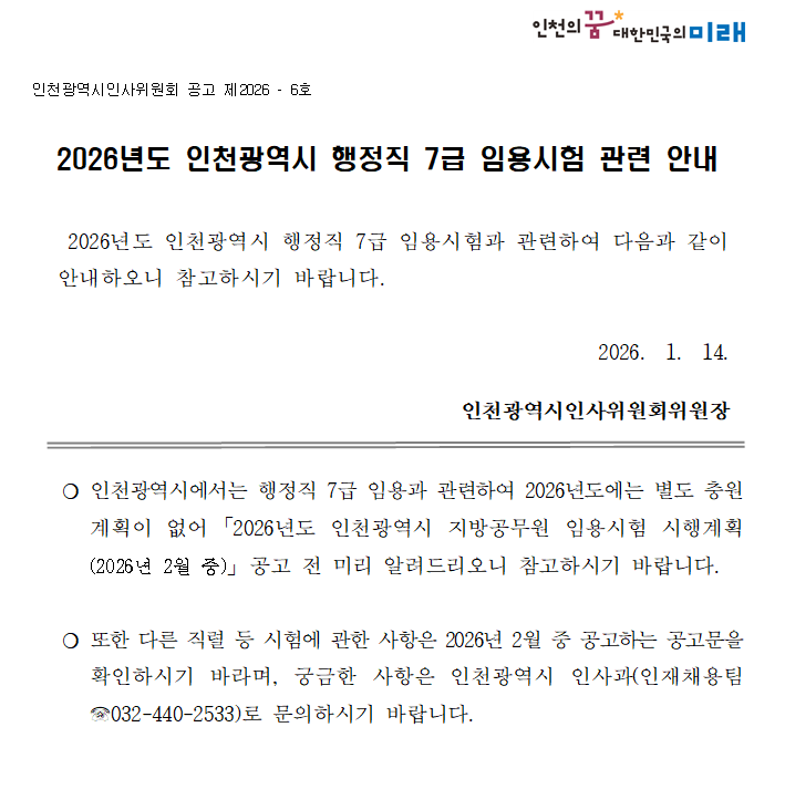 [7급][지방직] 2026년도 인천광역시 행정직 7급 임용시험 관련 안내