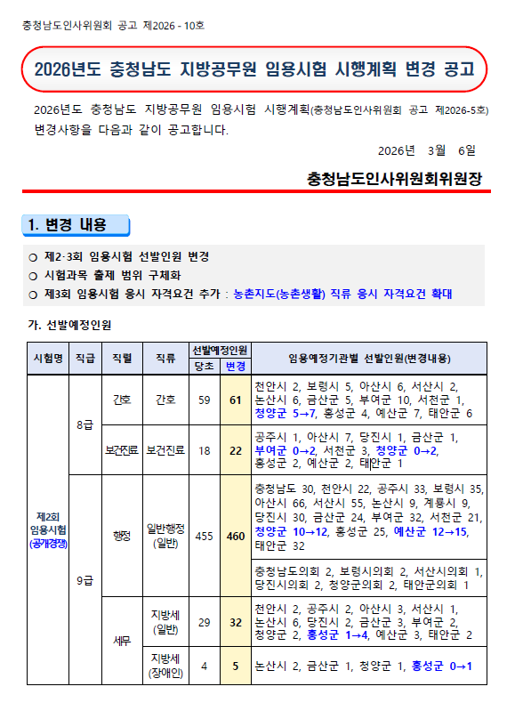 2026년 충청남도 지방공무원 임용시험 시행계획이 변경 공고되었습니다.