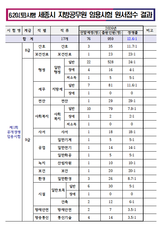 2026년 세종특별자치시 8,9급 지방공무원 원서접수 결과가 발표되었습니다.