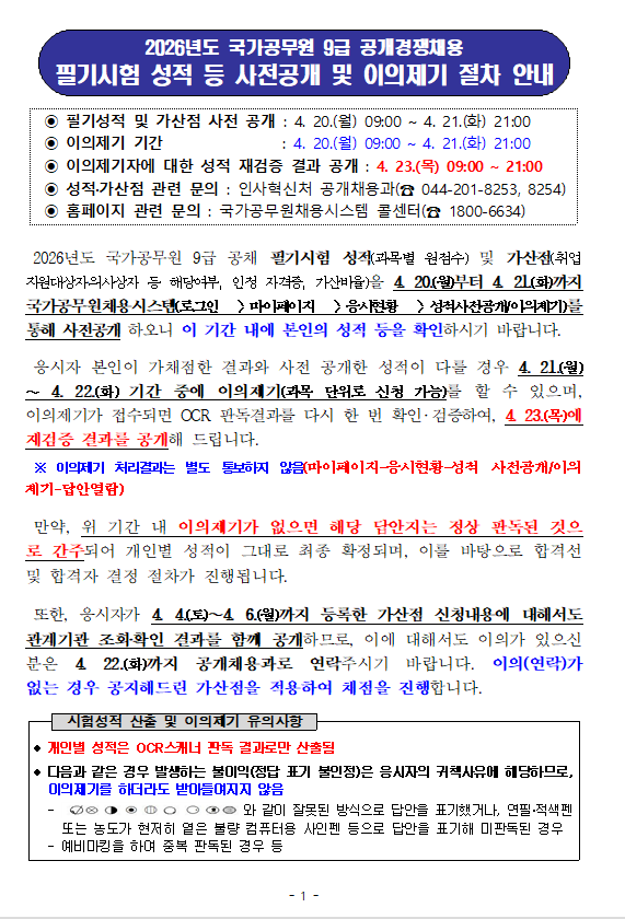 [9급][국가직] 2026년도 국가공무원 9급 공개경쟁채용 필기시험 성적 등 사전공개 및 이의제기 절차 안내