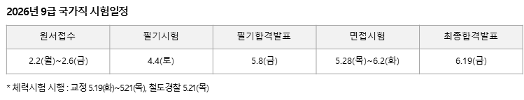 2026년 9급 국가직 공개채용 시험일정은 2월 2일(월) 원서접수를 시작한다.