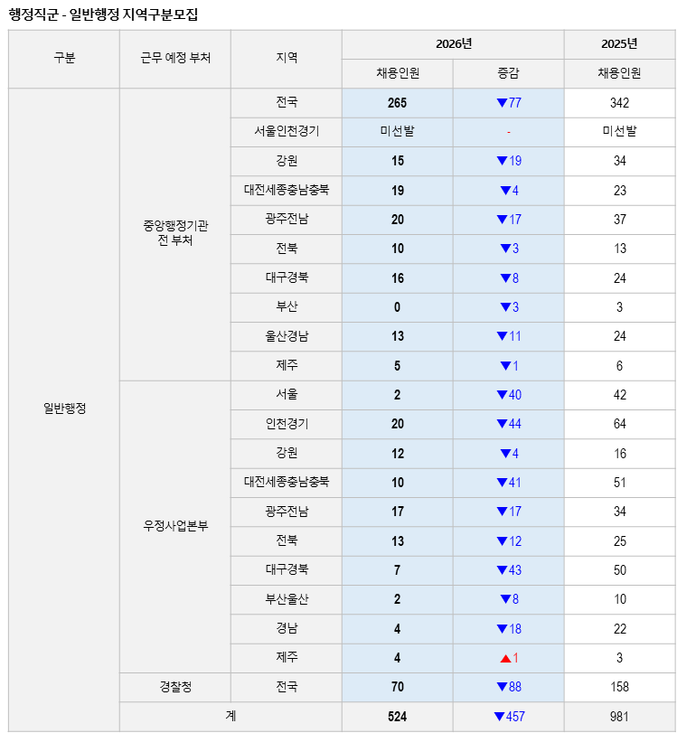 일반행정(중앙부처/우정사업본부/경찰청 합산)은 올해 총 524명을 선발하여