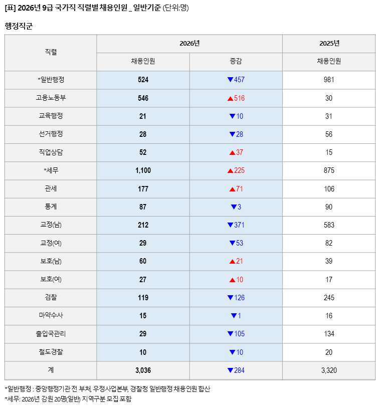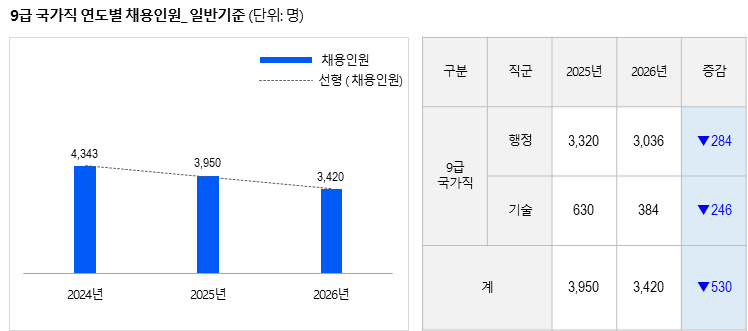 2026년 9급 국가직 채용인원은 일반전형을 기준으로 2025년 3,950명에서 530명 감소한 3,420명 규모로 확정되었다.
