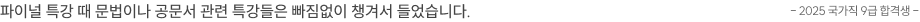 기본강의는 최대한 빠르게 듣고 기출문제를 최대한 빨리 시작해서 정복 하는 것이 공시 단기 합격 및 직장 병행 합격의 핵심이라고 할 수 있습니다.
