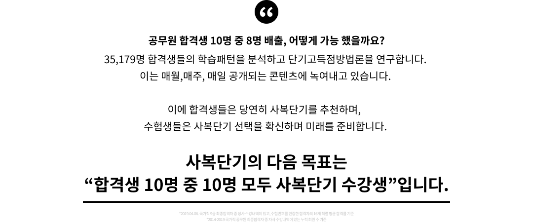 사복단기는 '초단기합격'을 위하여 수년간 약 52만건의 학습자 학습 패턴을 분석해서 만들어낸 단기 고득점 방법론을 거침없이 공개하고,